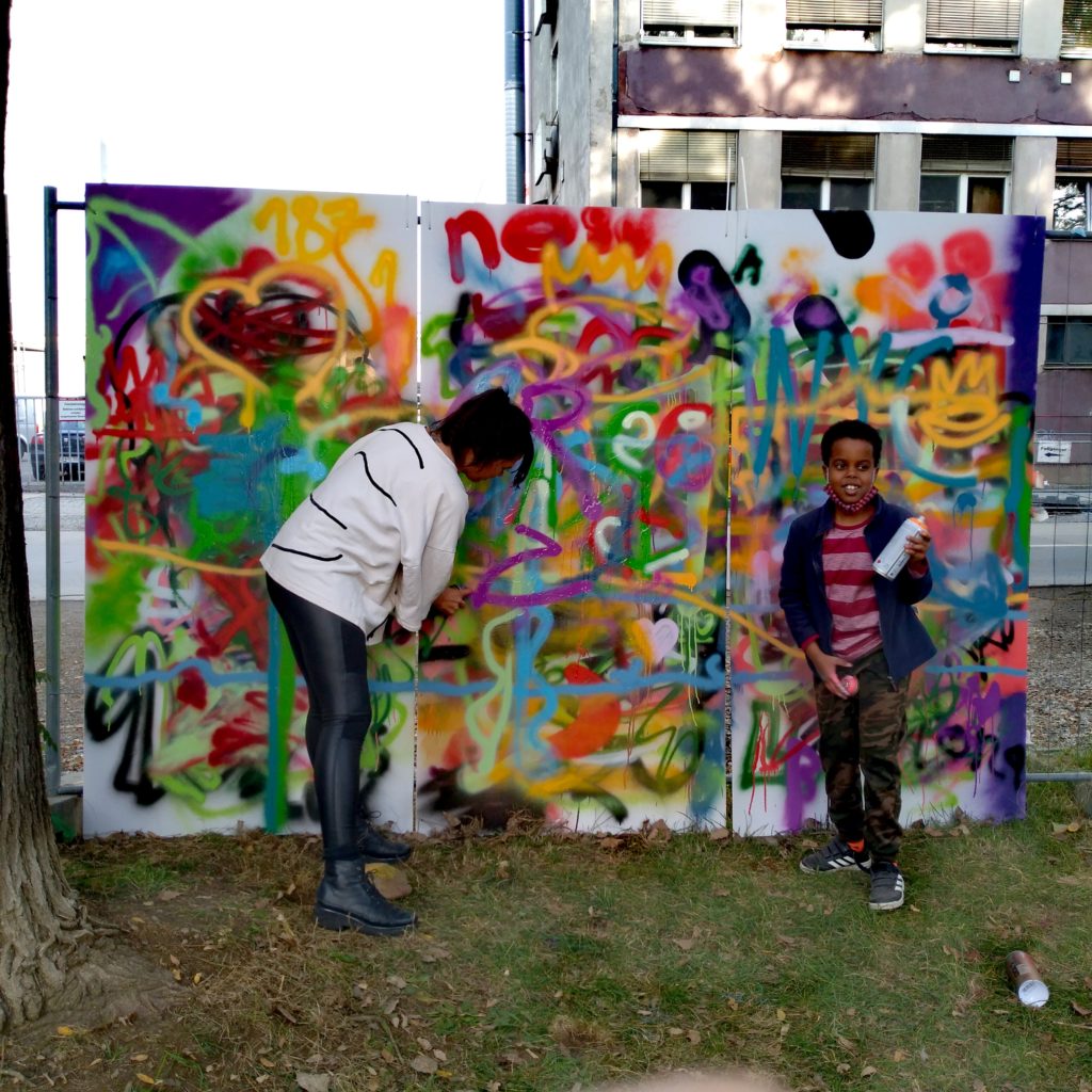 Die Grazer Künstler Georg Dinstl & Uwe Gallaun kennen sich mit Farbe aus und veranstalten für interessierte Bewohner*innen der WALD-Siedlung sowie für alle, die selber kreativ sein wollen und den Umgang mit Spraydosen erleben und erlernen wollen, einen kostenlosen, eintägigen Graffitti Workshop beim Büro für Pessimismus. Die Ergebnisse fließen auch in die Parkgestaltung im nächsten Jahr ein. Neben dem Wecken von Interesse für kulturelle und künstlerische Praktiken geht es – dem community building-Ansatz folgend – auch darum, über das Vehikel Graffiti die Themen Heimat und Identität zu bearbeiten.